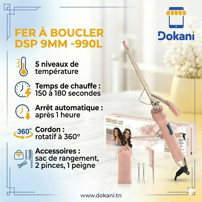 Le Fer à Boucler DSP 9 mm avec afficheur LED est spécialement conçu pour créer de magnifiques boucles fines, serrées et bien définies. Grâce à son tube chauffant en aluminium, son réglage précis de la température et sa chauffe rapide, il permet de réaliser des coiffures modernes, durables et pleines de caractère, tout en respectant la fibre capillaire 🔥✨