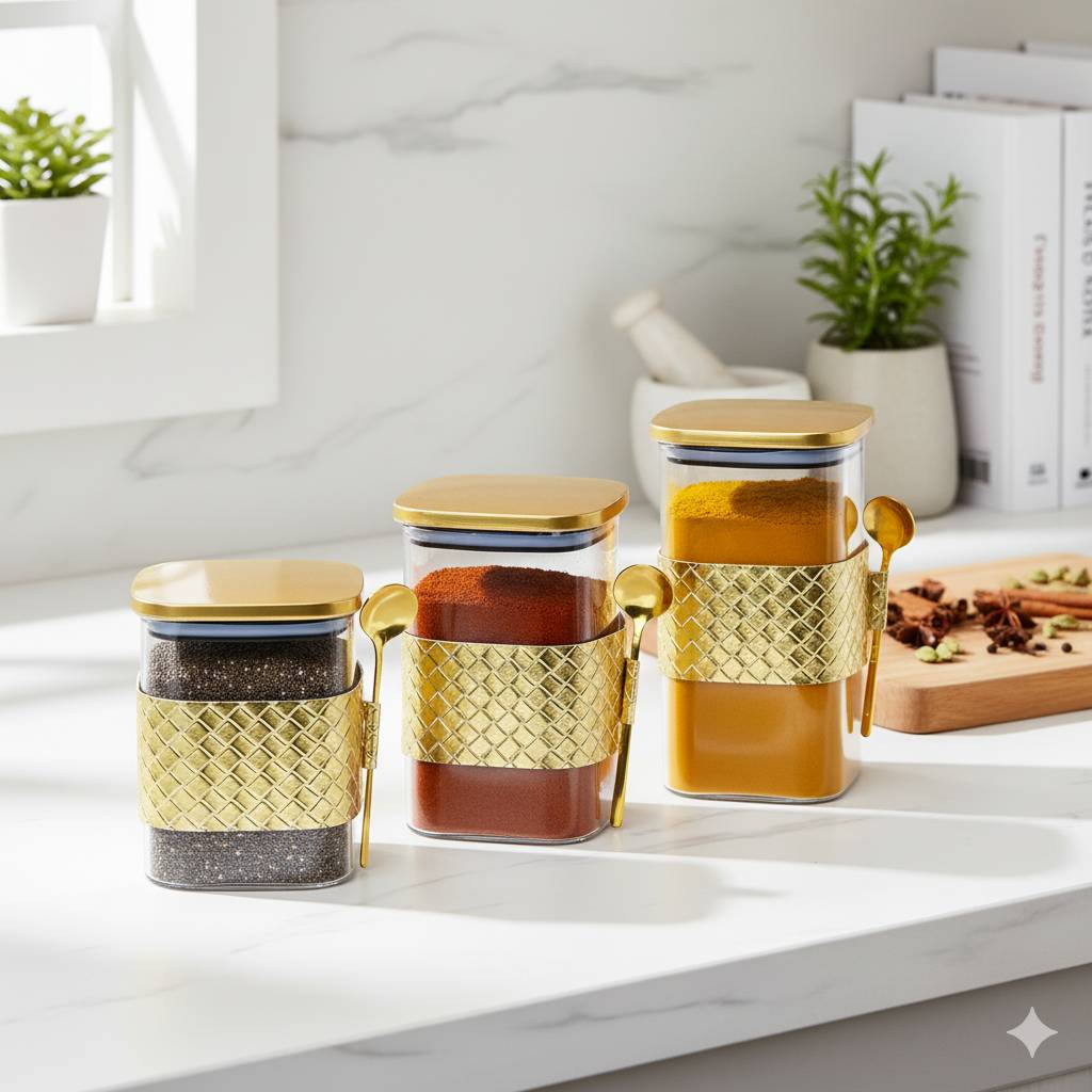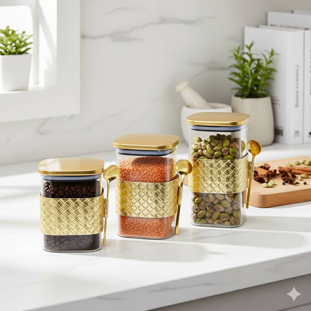 Apportez clarté et organisation à votre cuisine avec cet ensemble de rangement élégant et minimaliste ! ✨ Ce trio de bocaux allie la transparence du verre, un design tressé doré épuré, créant une esthétique à la fois chic et apaisante. Idéal pour conserver vos aliments secs, il s'intègre parfaitement à tout intérieur moderne.