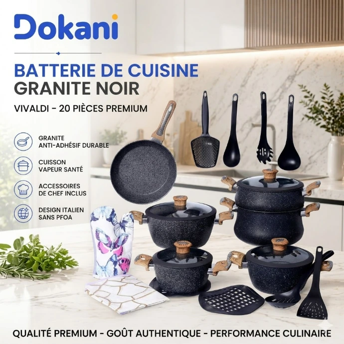 Découvrez la Batterie de Cuisine Vivaldi 20 Pièces en Granit, un ensemble ultra-complet conçu pour répondre à tous vos besoins culinaires 👩🍳✨.