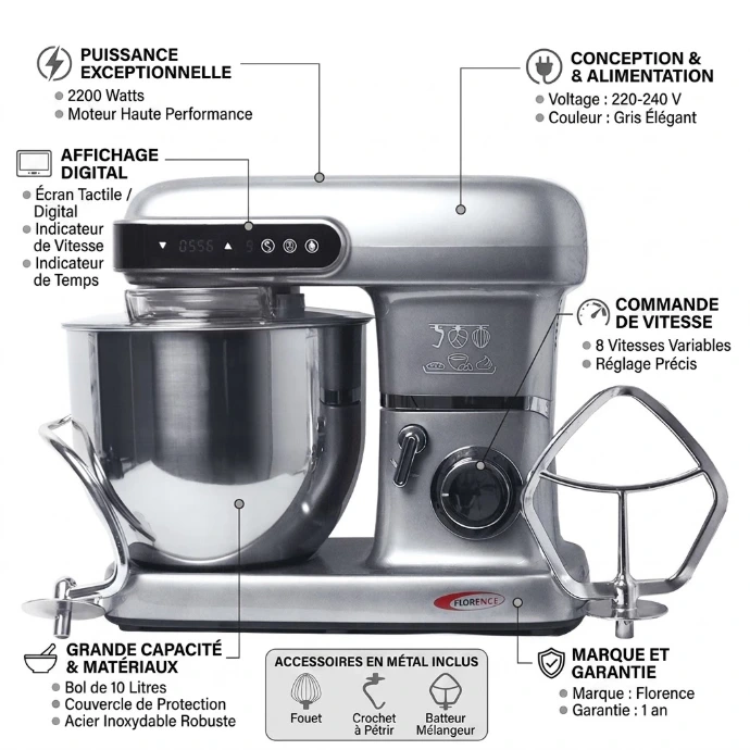 ✨ Robot Pétrin Florence 10L 2200W Gris – Puissance XXL & Précision Digitale ✨