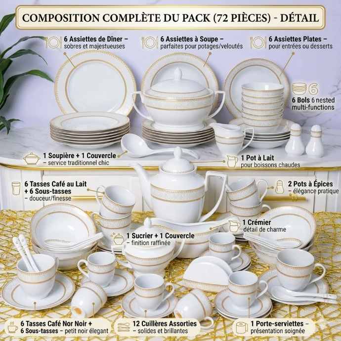 🍽️ 2. Un Coffret Ultra-Complet de 72 Pièces