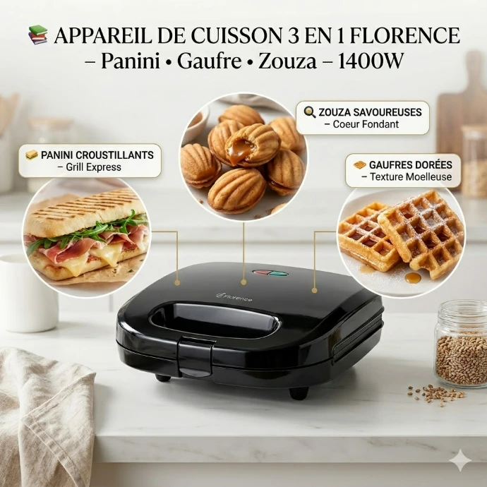🥪 Appareil de Cuisson 3 en 1 Florence – Panini • Gaufre • Zouza – 1400W