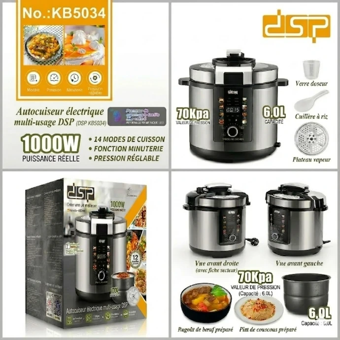 Transformez votre façon de cuisiner avec l'autocuiseur électrique multi-usage DSP 14-en-1, un appareil multifonction conçu pour vous offrir des plats savoureux, parfaitement cuits et prêts en un temps record ⏱️🍛. Grâce à sa grande capacité de 6 litres et à sa technologie de cuisson sous pression 70 KPA, il devient l’allié idéal pour toute la famille 👨👩👧👦.