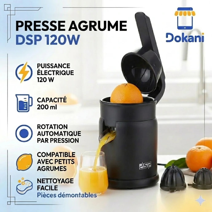 Le Presse-Agrumes Électrique DSP 200ml 120W sur Dokani est l’outil parfait pour un jus frais, rapide et sain, idéal pour les utilisateurs pressés ou les petites portions quotidiennes 🍊🥤✨