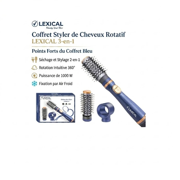Le Coffret Brosse Lexical 3-en-1 Bleu est bien plus qu'un simple accessoire de coiffure : c'est une véritable révolution pour votre routine beauté. Conçue pour celles qui recherchent un résultat professionnel sans effort, cette brosse rotative combine la puissance d'un sèche-cheveux de salon et la précision d'un styler expert. 💎✨