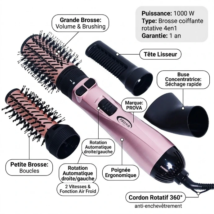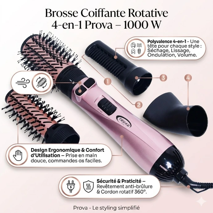 ✨ Brosse Coiffante Rotative 4en1 Prova – 1000W | Volume, Brillance & Coiffage Pro à Domicile ✨