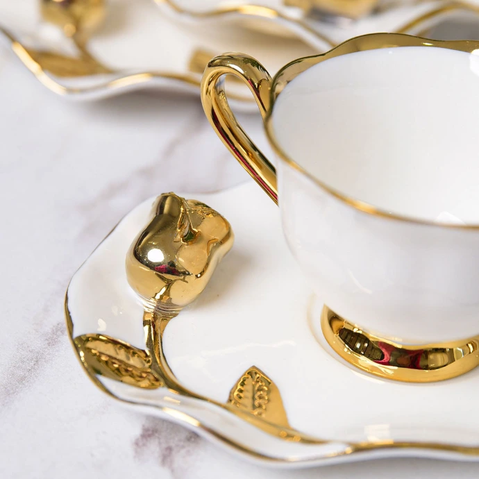 ☕✨ Service à Café en Porcelaine 24 Pièces – Élégance Blanc & Doré Motif Fleur ✨🌸