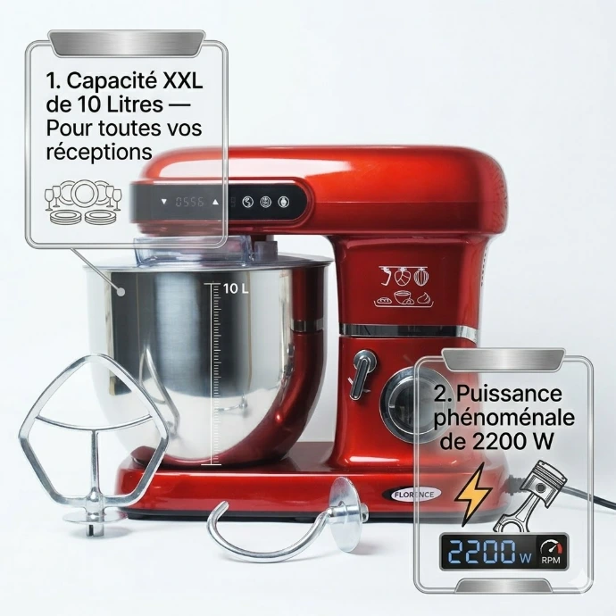 🍞🍰 Robot Pétrin Florence 10L – 2200 W – Rouge