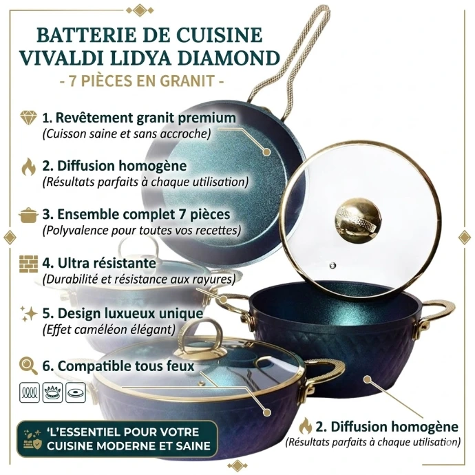 ✨ La Batterie de Cuisine Vivaldi Lidya Diamond 7 pièces est le choix parfait pour allier performance, durabilité et design haut de gamme.
