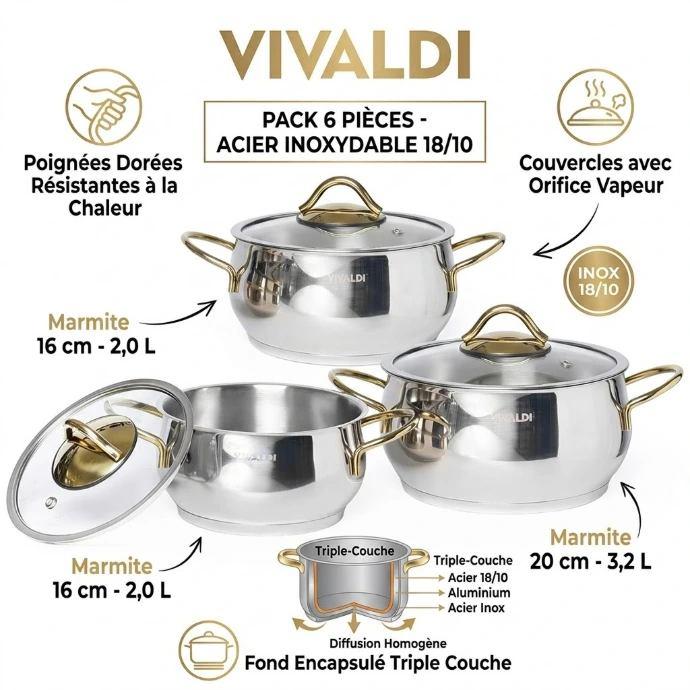 🥘 Batterie De Cuisine 6 Pièces Vivaldi – Inox 18/10 Premium ✨